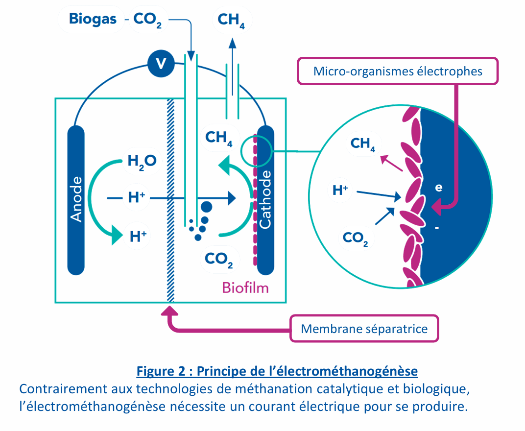 L'électrométhanogénèse est une des pistes prometteuses du développement du power-to-méthane, filière clé pour décarboner les usages gaz résiduels à horizon 2050. Appliquer une tension électrique sur des micro-organismes permet en effet d'améliorer la production de méthane en stimulant l’activité des micro-organismes fixés en biofilm sur les électrodes. Démontrée à l’échelle du laboratoire, l'efficacité du procédé subit cependant une chute dès qu'on le passe à l'échelle supérieure. D'un réacteur de 66 cm3 à un réacteur de 20 litres (soit un volume 300 fois plus important), l'efficacité énergétique passe de 50/60%... à moins de 20%.