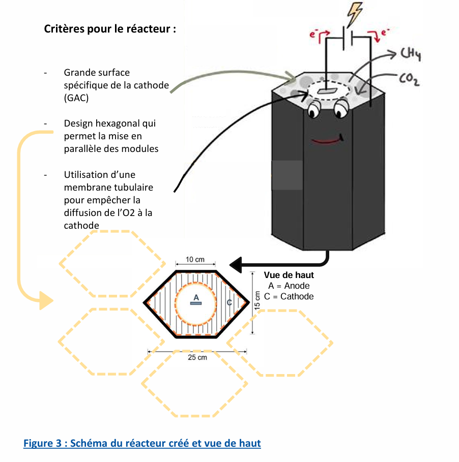 La conception du SBEC a aussi permis de limiter l'éloignement des électrodes (afin de maximiser la performance) et de séparer les réactions cathodiques des réactions anodiques (afin de réduire les pertes énergétiques). Côté matériaux, la cathode a été recouverte de charbon actif granulaire (connu pour sa stabilité thermique et sa résistance à la corrosion), afin de favoriser la fixation des micro-organismes nécessaires à la production de méthane. Pour l’anode, l'électrode en titane a été recouverte d'iridium-ruthénium (optimale pour l'oxydation de l'eau).