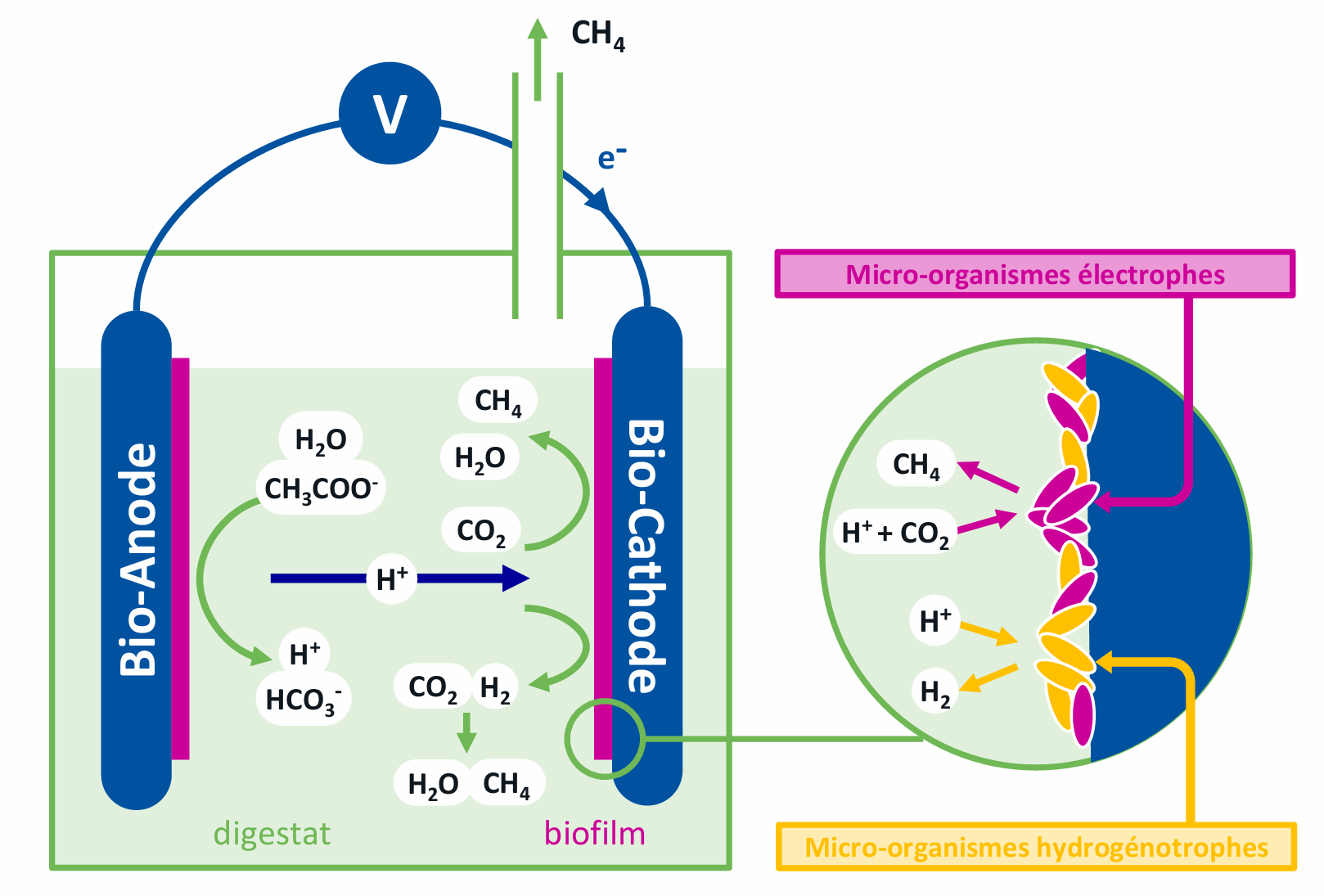 En appliquant un courant électrique dans un réacteur de méthanisation anaérobie, il est possible de favoriser l’activité des micro-organismes et donc de stimuler la production de méthane (figure 1). Mais, dans quelles conditions ce procédé, appelé électrométhanogenèse, permet-il d'améliorer la production de biométhane à partir des résidus de méthanisation ?