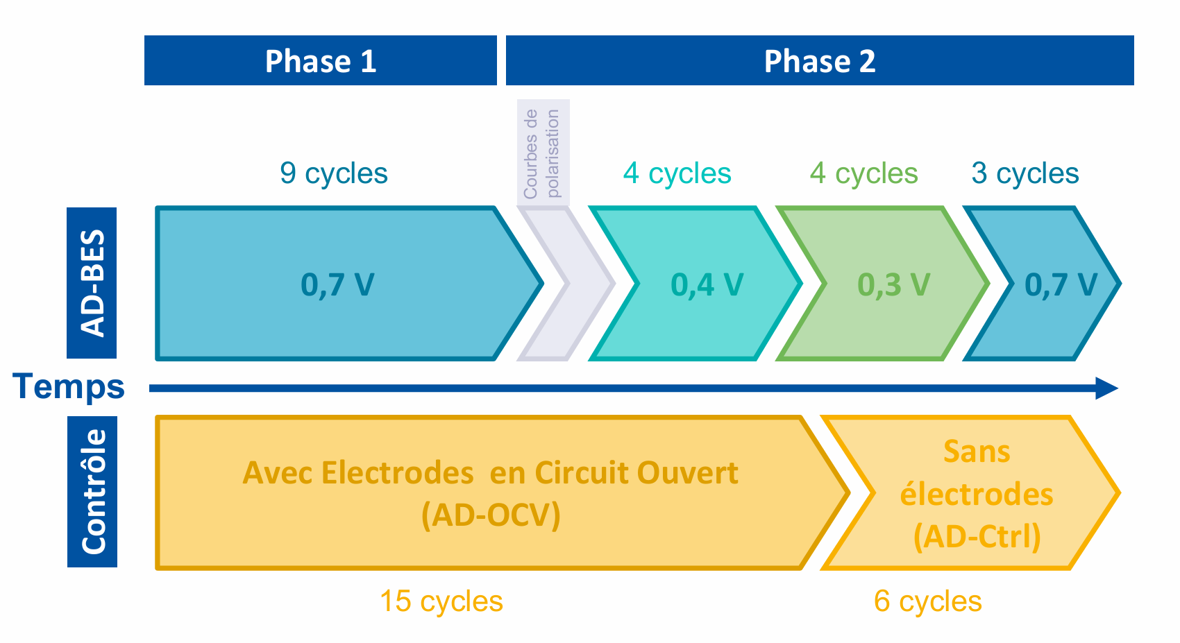 - une phase d'alimentation des réacteurs par un seul des trois digestats. Pendant cette phase comptant 13 cycles de 7 jours, des tensions différentes tensions ont été appliquées : décroissante par palier d'une heure et sur trois niveaux (0,3V, 0,4V et 0,7V). Cette phase a permis d'établir dans quelle mesure la nature du biofilm qui s'était formé sur les électrodes influençait les performances de l'électrométhanogenèse.